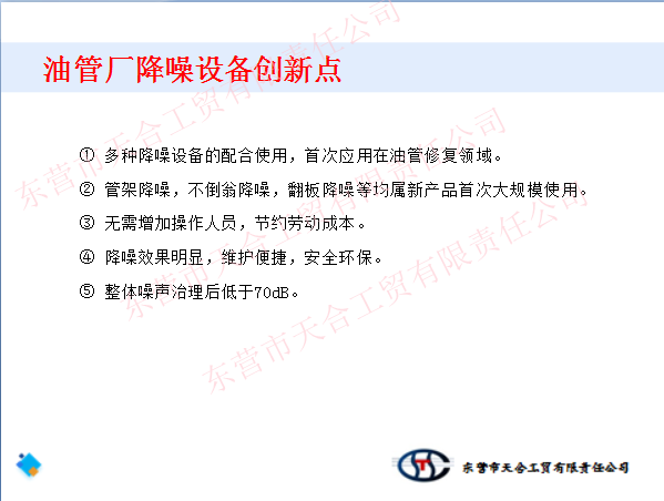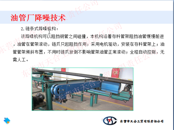 我公司從事油管廠整體噪聲治理多年,對油管廠的噪聲有詳細的了解和解決各類噪聲的完整方案,并且現場經驗十分豐富,針對不同的要求設計出適合客戶的解決方案。從聲源上根治噪聲,經治理后的設備的噪聲從原有110分貝降至65分貝以下,有力的改善職工的工作環境和降低周圍的噪聲污染。